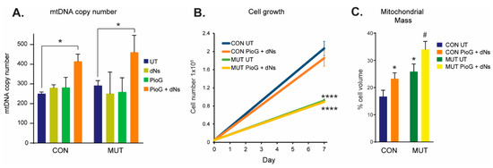 2.1. Combination Treatment with Pioglitazone (PioG) and Deoxyribonucleosides (dNs) Increases mtDNA Copy Number and Mitochondrial Mass in Both Control and m.3243A>G Mutant Cybrids