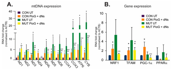 2.2. PioG + dNs Treatment Increases mtDNA Transcript Levels in Control Cybrids, but Not in MUT Cybrids