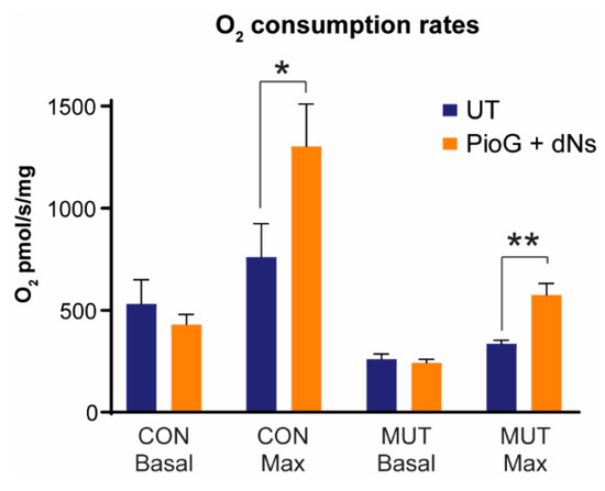 2.4. Treatment with PioG + dNs Increases Mitochondrial Respiratory Capacity in both Control Cybrids and MUT Cybrids