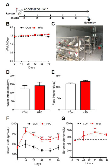 To establish the long-term hyperuricemia model of chickens, 24-week-old male white leghorns were reared in cages and allowed to consume feed and water ad libitum (Figure 3A,C). Based on different protein contents in the feed: CON (19.11% crude protein) and HPD (34.88% crude protein) were set up (Table 1). During 10 weeks feeding, we detected the weight, serum urate levels, water and food intake changed once every two weeks. There were no significant differences in the weight gain, water intake, and food intake between CON and HPD groups (Figure 3B,D,E). However, the serum urate levels in the HPD group significantly increased compared with those in the CON group after two weeks feeding (Figure 3F). The trend of serum urate in HPD was relatively declined at 28-days and then gradually turned to stable until the end of experiment. It was obvious that HPD consistently increased the serum urate and maintained significantly high-level condition during whole period feeding. To test if the serum urate level changed at the beginning of feeding HPD or not, we detected the serum urate level after changing into HPD feeding at 12, 48, 96, and 144 h in several chickens (n = 6). Interestingly, the serum urate levels were increased just after 48-h feeding and gradually increased to approximately 650 μmol/L when chickens have received the HPD 144-h (Figure 3G).