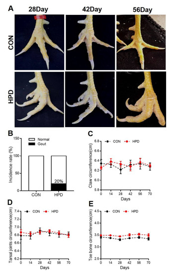 HPD induces an abnormal claw morphology in chickens. (A) Representative images of chicken claws after being fed for 28, 42, and 56 days. (B) Gout incidence rate. (C) Claw circumference, (D) tarsal joint circumference, and (E) toe bone circumference of chicken. Values are presented as the mean ± SEM.