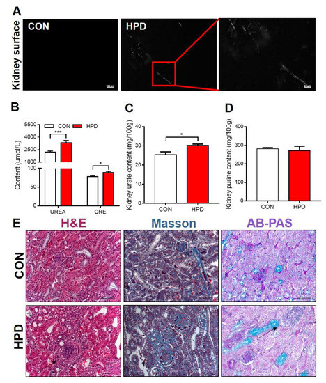 Hyperuricemia is closely related to renal injury. MSU crystals were detected on the surface of the kidney in the HPD group under polarized brightfield microscopy (Figure 7A). The biochemical parameter serum urea and creatine increased in the HPD group. These parameters are markers of renal injury, possibly due to MSU crystal products in the kidney (Figure 7B). The kidney urate content increased in the HPD group, while the purine content showed no difference between CON and HPD groups (Figure 7C,D). H&E statins showed lesions in the HPD group, in particular, inflammation-like cells enriched around the glomerulus. Masson staining showed no difference between CON and HPD groups. Alcian Blue Periodic acid Schiff (AB-PAS) staining showed mildly PAS-positive reaction, but simultaneously detected the inflammatory cell assembled in the kidney of HFD chickens (Figure 7E).