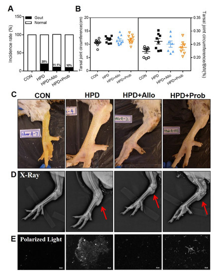 Allopurinol and probenecid treatment decreases gout incidence rate in chickens. (A) Gout incidence rate (n = 8–10). (B) Tarsal joint circumference and tarsal joint circumference/BW of chicken claws. (C) Representative images of chicken claws in 73 days. (D) Representative images of chicken claws in X-ray conditions. The red arrows are the position of swell in the joint of chickens. (E) Representative images of MSU crystal in synovial fluids of chicken claws using polarized light microscopy (scale: 50 µm). Values are presented as the mean ± SEM.