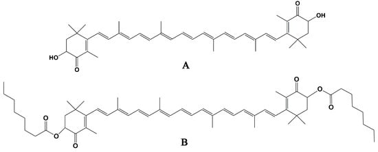 - Fukami, H.; Namikawa, K.; Sugiura-Tomimori, N.; Sumida, M.; Katano, K.; Nakao, M. Chemical synthesis of astaxanthin n-octanoic acid monoester and diester and evaluation of their oral absorbability. J. Oleo Sci. 2006, 55, 653–656. [Google Scholar] [CrossRef]