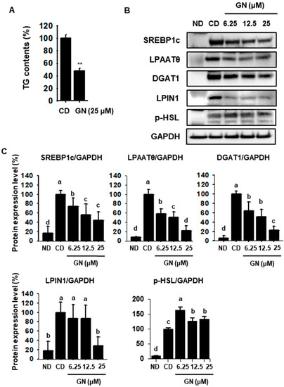 Effects of GN on triglyceride synthesis in 3T3-L1 cells. (A) Intracellular triglycerides (TGs) in 3T3-L1 cells treated with GN were measured using a TG ELISA kit. (B,C) Western blotting for the lipogenesis factors sterol regulatory element-binding transcription factor 1c (SREBP1c), lysophosphatidic acid acyltransferase theta (LPAATθ), diacylglycerol acyltransferase 1 (DGAT1), phosphatidate phosphatase (LPIN1) and phosphorylated hormone sensitive lipase (p-HSL) in 3T3-L1 cells and quantification of band density. Protein data are expressed as mean ± SD (n = 4). Values with different letters are significantly different, p < 0.05 (a > b > c > d).