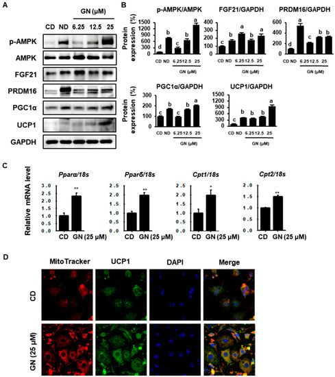 To evaluate the browning effect of GN, 3T3-L1 cells were treated with various concentrations of GN (6.25, 12.5 or 25 μM) during differentiation, and protein phosphorylation/levels of thermogenic markers were then measured by Western blotting. GN treatment significantly increased phosphorylated AMPK (p-AMPK) and BAT markers, including fibroblast growth factor (FGF21), PRDM16, PGC1α and UCP1 (Figure 3A,B). Moreover, treatment with 25 μM GN up-regulated mRNA levels of FAO genes, such as peroxisome proliferator-activated receptor alpha (Pparα), peroxisome proliferator-activated receptor delta (Pparδ), carnitine palmitoyltransferase 1 (Cpt1) and carnitine palmitoyltransferase 2 (Cpt2). A recent study suggested that UCP1 in mitochondria inner membranes plays an important role in energy consumption [30,31]. We analyzed differentiated cells treated with GN using immunostaining. MitoTracker Red staining, an indicator of mitochondrial activity and UCP1 expression (conjugated with FITC green) were increased by 25 μM GN in a dose-dependent manner. These changes to a BAT-like phenotype are generally associated with increased metabolic rate (Figure 3D).