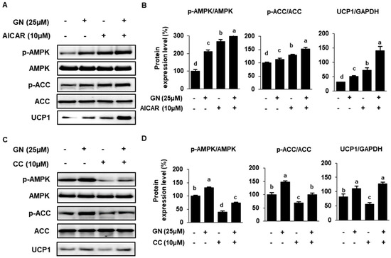 Effects of AMPK activation in 3T3-L1 cells treated with GN. (A,B) 3T3-L1 cells were treated with 10 μM AICAR ± 25 μM GN, and effects on protein phosphorylation and/or expression were determined by Western blotting. (C,D) 3T3-L1 cells were treated with 10 μM CC ± 25 μM GN, and effects on protein phosphorylation and/or expression were determined by Western blotting. Protein data are expressed as mean ± SD (n = 4). Values with different letters are significantly different, p < 0.05 (a > b > c > d). AICAR; 5-aminoimidazole-4-carboxamide ribonucleotide, CC; Compound C, 6-[4-(2-Piperidin-1-yl-ethoxy)-phenyl)]-3-pyridin-4-yl-pyrrazolo[1,5-a]-pyrimidine.