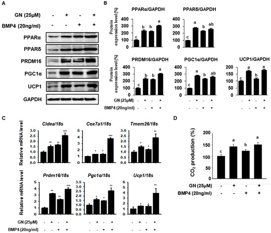 Synergistic effects of BMP4 and GN on thermogenesis in 3T3-L1 cells. (A,B) Western blotting for the browning factors PPARα, PPARδ, PRDM16, PGC1α and UCP1 in 3T3-L1 cells and band density quantification. All data are expressed as mean ± SD (n = 4) and values with different letters are significantly different, p < 0.05 (a > b > c > d). (C) Relative mRNA expression levels of the thermogenic genes Cidea, Cox7a1, Tmem26, Prdm16, Pgc1α and Ucp1 were determined by qPCR and normalized to 18S rRNA expression. (D) Relative CO2 production was analyzed using a carbon dioxide assay kit according to the manufacturer’s instructions. mRNA data are expressed as mean ± SD (n = 4) and values with different letters are significantly different * p < 0.05, ** p < 0.01, *** p < 0.001. BMP4; Bone morphogenetic protein 4.