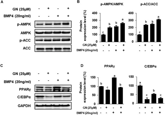 Finally, we investigated the relative effects of GN and BMP4 on regulation of lipid metabolism. Prior reports have demonstrated that BMP4 stimulates WAT-to-BAT differentiation in mature adipocytes by increasing AMPK activation [36]. Treatment with BMP4 significantly up-regulated p-AMPK and p-ACC in 3T3-L1 cells, and GN/BMP4 co-treatment synergistically increased p-AMPK and p-ACC (Figure 6A,B). Transcription factors associated with adipogenesis, including PPARγ and C/EBPα, were measured. BMP4 increased PPARγ expression and decreased C/EBPα expression (Figure 6C). PGC1α is a key regulatory factor in BMP4-mediated adipocyte browning, such that PPARγ associated with PGC1α could increase during adipocyte differentiation [34]. However, GN treatment effectively reduced the adipogenic markers PPARγ and C/EBPα in 3T3-L1 cells. Together, these findings suggested that GN induction of a BAT-like phenotype during 3T3-L1 differentiation was greater than that of BMP4, a well-known inducer of adipocyte browning.