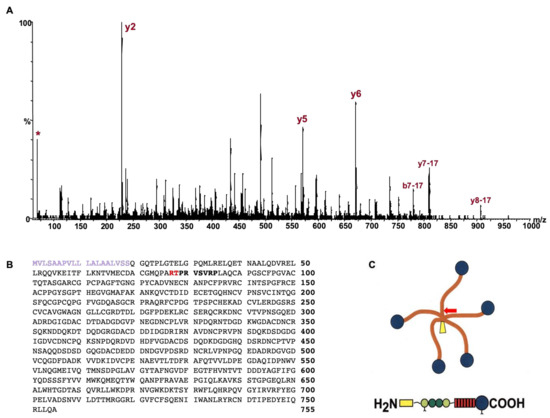(A). Tandem mass spectrum of the neoepitope peptide “TPRVSVRPL” generated after chymotrypsin digestion and identified by mass spectrometry. The matching b- and y –ion fragments are labelled and the immonioum ion of proline is labeled with (*). (B) COMP sequence showing the cleavage site (in red) identified by mass spectrometry. The signal sequence is shown in purple. (C) Approximate location of the cleavage site after the 58th amino-acid and close to the disulphide bonds of the junctional region of COMP (arrow).