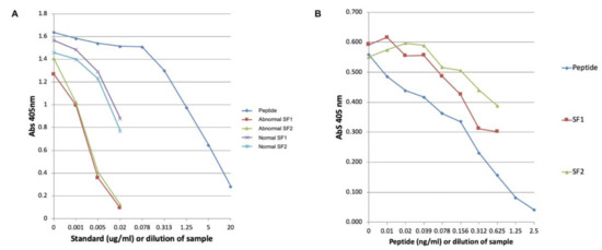 Parallel inhibition curves for (A) original neoepitope assay and (B) modified assay including spanning peptide to block cross-reactivity of the neoepitope antiserum with intact COMP. Both normal and abnormal synovial fluids show good parallel inhibition in both assays.
