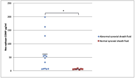 Normal digital sheath synovial fluid (n = 7) contained on average 5.3 ± 1.3 µg/ml of COMP neo-epitope. In contrast horses with intra-synovial tendon injuries (n = 13) had COMP neo-epitope levels of 58.8 ± 64.3 µg/mL (Figure 4) which was significantly different from the controls (p = 0.002). However, there was large variation between the abnormal samples, ranging from 5.6–198.6 µg/mL.