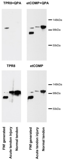 - Dakin, S.G.; Smith, R.K.; Heinegard, D.; Onnerfjord, P.; Khabut, A.; Dudhia, J. Proteomic analysis of tendon extracellular matrix reveals disease stage-specific fragmentation and differential cleavage of COMP (cartilage oligomeric matrix protein). J. Biol. Chem. 2014, 289, 4919–4927. [Google Scholar] [CrossRef]
