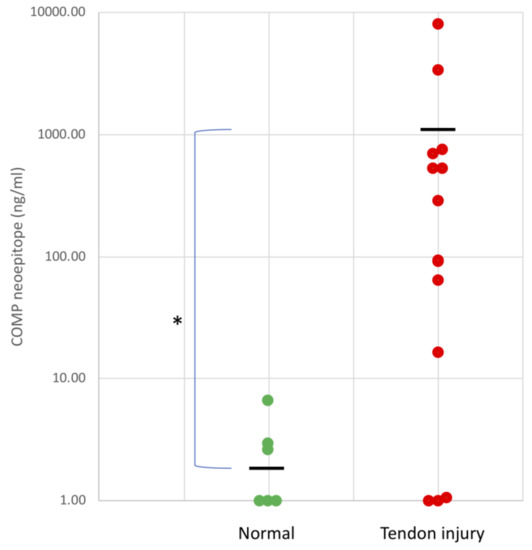 Quantification of the neoepitope in synovial fluids from normal tendon sheaths (n = 6) and from tendon sheaths containing tendon injury (n = 14). Samples with values under the detectable range of the assay were given a value of 1 ng/mL which is the limit of detection of the assay. Lines show the mean levels for each group. Note the logarithmic scale on the y axis to enable comparison between normal and cases and the large difference in neoepitope concentration between normal (<10 ng/mL) and those with injury (an average of 500-fold higher; * p = 0.013).