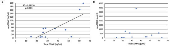 The values for total COMP were 38.6 ± 14.7 µg/mL for the cases with tendon injury compared to 17.2 ± 4.5 µg/mL for the controls. This was significantly different (p = 0.003). When these values were compared to the neo-epitope values for the original assay there was a significant relationship between the two (Figure 7). However, when the comparison was made with the modified assay using the spanning peptide to limit the cross-reactivity, there was no such correlation.