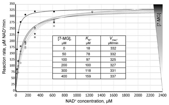 Dependence of the PARP-1-catalyzed reaction rate on the NAD+ concentration at different concentrations of 7-MG added to the reaction mixture. Insert: calculated KMapp values increase with increasing 7-MG concentrations, thus demonstrating the competitive inhibition mechanism.