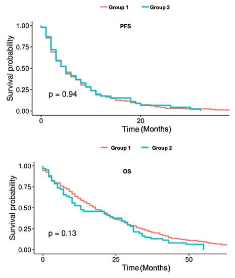 PFS and OS comparison between patients with stable (Group 1) and converted tumor subtype (Group 2).