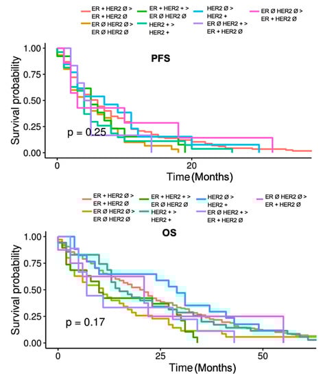 PFS and OS comparison between seven subgroups based on specific receptor change or stable patterns between PTs and MTs. Ø—negative; ER—estrogen receptor; HER2—human epidermal growth factor receptor 2.