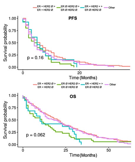 PFS and OS comparison between four patient subgroups based on therapeutically relevant receptor change or stable patterns between PTs and MTs. Ø—negative; ER—estrogen receptor; HER2—human epidermal growth factor receptor 2.