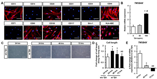 Treatment with Tβ4 promotes morphological changes in hASCs. (A) Immunofluorescence images of cell surface markers in hASCs indicate positive expression for CD13, CD29, CD44, CD90, CD106, Stro-1, and HLA-ABC and negative expression for CD14, CD31, CD34, CD71, and CD117. Scale bar = 100 μm. (B) Real-time PCR analysis of relative endogenous TMSB4X mRNA expression in hASCs after 24 h of dose-dependent exogenous treatment with Tβ4 (0, 50, and 100 ng/mL). * p < 0.05 vs. 0 ng/mL; # p < 0.05 vs. 50 ng/mL. (C) Representative phase-contrast images of hASCs at 24 h, 48 h, and 72 h after a single Tβ4 treatment (100 ng/mL). Scale bar = 100 μm. (D) Elongated cell length after a single treatment with Tβ4 at 24 h and 48 h compared to cell length of untreated cells. * p < 0.05 vs. without Tβ4 treatment. (E) Changes in TMSB4X mRNA expression upon a single Tβ4 treatment. Data are shown as Δ (fold change of 2−∆∆Ct values at 24 h, 48 h, and 72 h after Tβ4 treatment compared to that without Tβ4 treatment). * p < 0.05 vs. 2−∆∆Ct values of without Tβ4 treatment; NS, not significant; w/ Tβ4, with Tβ4 treatment; w/o Tβ4, without Tβ4 treatment.