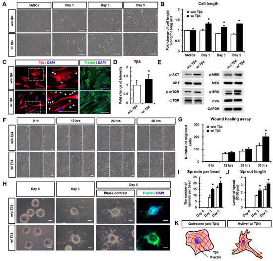 Tβ4 induces the active state of hASCs. (A) Representative phase-contrast images and (B) Quantitative analysis of cell length along the long axis of hASCs after long-term exogenous treatment with Tβ4 (100 ng/mL). Scale bar = 100 μm. * p < 0.05 vs. without Tβ4 at each time point. (C) Immunofluorescence images and (D) Quantitative analysis of fluorescence intensities of Tβ4 after 24 h of treating hASCs in combination with Tβ4. Actin cytoskeleton (F-actin) was stained with phalloidin. White arrowheads indicate the elongation of the cell body upon Tβ4 expression. Scale bar = 100 μm. * p < 0.05 vs. without Tβ4. (E) Activation of the AKT/mTOR and MEK/ERK signaling pathways in hASCs upon Tβ4 treatment confirmed by western blot. Quantitative analysis of band intensities is illustrated in Figure S2A. (F) Representative phase-contrast images of wound healing assay at different time points. Cells were wounded and treated with Tβ4 at 0 h. Scale bar = 100 μm. (G) Quantification of the migrated cell number at 0, 12, 24 h, and 36 h after scratching. * p < 0.05 vs. without Tβ4 treatment at each time point. (H) Microbead sprouting assay of hASC-coated microbeads. Beads were seeded on Matrigel and treated with Tβ4. At day 5, hASC-coated microbeads were stained for F-actin. Scale bar = 100 μm. (I) Number of sprouts per bead and (J) sprout length were measured using phase-contrast images. * p < 0.05 vs. without Tβ4 at each time point. (K) Schematic diagram depicts the active state of hASCs upon exogenous treatment with Tβ4 via morphological alterations and activation of intracellular signaling pathways. w/ Tβ4, with Tβ4 treatment; w/o Tβ4, without Tβ4 treatment.