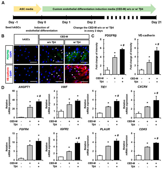 We next investigated whether Tβ4 could influence the endothelial differentiation of hASCs. Endothelial differentiation was induced using custom endothelial differentiation induction media (CED-M), and the medium was additionally treated with Tβ4 every 48 h (Figure 3A). After 21 days of induction, hASCs cultured in CED-M were found to have an increased expression of PDGFβ and VE-cadherin compared to hASCs. In addition, the expression of these proteins was significantly promoted upon additional treatment with Tβ4 (Figure 3B,C). Indeed, the mRNA expression of various angiogenic factors and receptors including ANGPT1, VWF, TIE1, CXCR4, FGFR4, IGFR2, PLAUR, and CDK5 was found to be significantly increased upon CED-M-mediated differentiation induced by Tβ4 treatment compared to that observed in normal hASCs and cells that underwent CED-M-mediated differentiation without Tβ4 treatment (Figure 3D). Therefore, additional treatment with Tβ4 promoted endothelial differentiation of hASCs with elevated expression of angiogenesis-related genes.
