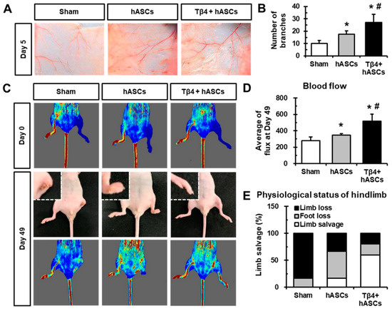 Transplantation of hASCs in combination with Tβ4 improves blood vessel recruitment and blood flow after ischemia. (A) Representative images of mouse dorsal window chamber model after 5 days of transplantation of chambers containing hASCs without or with Tβ4. (B) Quantification of the number of microvessel branches per chamber depending upon the transplantation condition. * p < 0.05 vs. Sham; # p < 0.05 vs. hASCs. n = 3 rats in each group. (C) Representative Laser Doppler images after induction of hindlimb ischemia (day 0) and after 49 days of transplantation. Magnified inlet images show limb loss in the sham group and foot loss in the hASCs group. Sham (n = 6); hASCs (n = 5); Tβ4 + hASCs (n = 6). (D) Measurement of blood flow at day 49, as measured by Laser Doppler images. * p < 0.05 vs. Sham; # p < 0.05 vs. hASCs. (E) Percentage of physiological status of hindlimb after 49 days of ischemia and transplantation. * p < 0.05 vs. Sham; # p < 0.05 vs. hASCs.