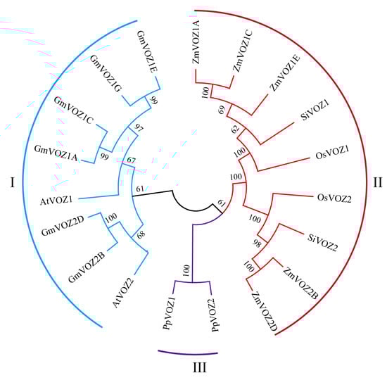 Six soybean VOZ genes were annotated and designated as GmVOZ1A, GmVOZ1C, GmVOZ1E, GmVOZ1G, GmVOZ2B, and GmVOZ2D [25]. To elucidate the evolutionary history of soybean VOZ genes and their phylogenetic relationship with VOZ family genes in other organisms, VOZ proteins from five other plant species, Arabidopsis, rice, maize, foxtail millet, and P. patens, were aligned, and then a phylogenetic tree was constructed (Figure 1). All VOZ proteins were divided into three distinct clusters, denoted as cluster I to III. Cluster I contained soybean and Arabidopsis VOZ proteins. Cluster II had VOZ proteins from rice, maize, and foxtail millet, and P. patens VOZ proteins were assigned to cluster III. Multiple alignments showed that VOZ proteins from soybean, Arabidopsis, rice, and P. patens shared two conserved domains, termed domain-A and domain-B. Domain-B, containing a zinc finger motif composed of three conserved cysteines and one histidine residue, was also designated as the VOZ-domain (Figure S1) [15].
