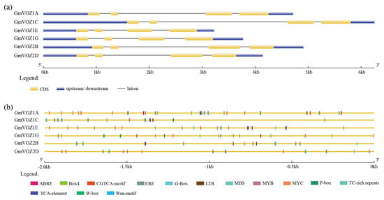 The coding and genomic DNA sequences of the soybean VOZ gene were retrieved from the Phytozome database. The exon–intron arrangements of soybean VOZ genes were defined using the online program Gene Structure Display Server2.0 (GSDS) by comparing coding sequences and the corresponding genomic DNA sequences [58]. The 2.0 kb promoter sequences upstream of the soybean VOZ gene transcription initiation site were extracted from the Phytozome database. Potential cis-acting elements of extracted promoter regions were analyzed using the PlantCARE database [59].