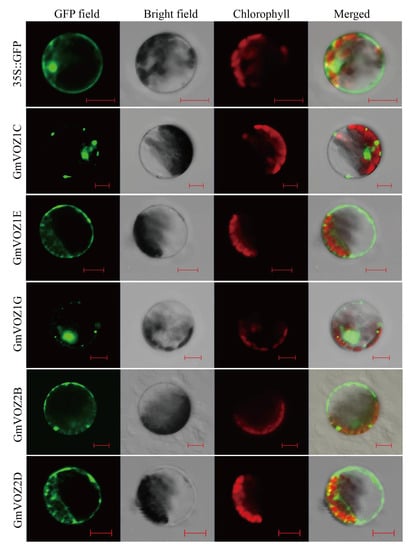 The subcellular localization of a protein is closely related to its biological function [27]. To investigate the subcellular distribution of GmVOZ proteins, the open reading frames (ORFs) of GmVOZ genes, lacking the stop codon, were fused to the N-terminal end of the GFP reporter gene. The recombinant GmVOZs–GFP fused plasmids were transformed into Arabidopsis protoplasts and monitored by confocal microscopy. It was observed that GmVOZ1E, GmVOZ2B, and GmVOZ2D were located primarily in the cytosol, and the GFP fluorescence of GmVOZ1G fusion protein mainly appeared in the nucleus. GmVOZ1C was probably located in the nucleus, and the possibility of localization in other organelles, such as endoplasmic reticulum (RE), mitochondria or chloroplasts, could also not be ruled out. This is uncertain due to the lack of the corresponding control (Figure 3). Additionally, the fluorescence of GmVOZ1A fusion protein was not detected in Arabidopsis protoplasts cells (Figure 3).