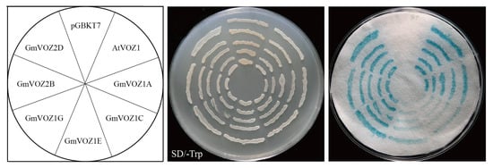The transcriptional activation activity of GmVOZ proteins was analyzed using a yeast transactivation system. GmVOZ genes were subcloned into a yeast GAL4-DNA binding domain expression vector (pGBKT7), which was subsequently transformed into yeast strain AH109, and then the ability of GmVOZ proteins to activate the transcription of the LacZ reporter gene was detected. As shown in Figure 4, the yeast strain cells harboring the different recombinant plasmids grew well on selective medium SD/-Trp. When we used X–α–Gal, it was discovered that the positive control pGBKT7-AtVOZ1 and the cells containing pGBKT7-GmVOZs showed β–galactosidase activity, whereas the negative control pGBKT7 had no β–galactosidase activity, indicating that soybean VOZ proteins possessed transcriptional activation activity in yeast cells. This finding is in accordance with a previous report on the transactivation activity of VOZ proteins in Arabidopsis [15]. Moreover, GmVOZ1C and GmVOZ1E displayed relatively lower levels of transcriptional activation activity, as determined by their ability to activate the expression of the LacZ reporter gene (Figure 4).