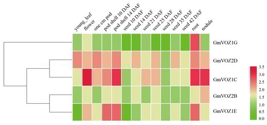 A RNA–Seq atlas of Glycine max was used to identify the expression pattern of GmVOZ genes in different tissues [28]. Fourteen tissues at different stages were selected for analysis, including a young leaf, flower, root, nodule, and various stages of pod and seed development. GmVOZ genes were expressed in nearly all tissues tested, while the basal expression of GmVOZ1A was not detected in the RNA–Seq atlas (Figure 5). The results revealed that distinct GmVOZ genes exhibited high variation in their expression profiles, dependent on tissue/organ types and developmental stages. GmVOZ2D had higher expression levels in the young leaf, pod, and root, while GmVOZ1E had no expression in the young leaf or seed at 10 DAF (days after flowering) but was highly expressed in the root. GmVOZ1C was expressed most strongly in the flower. GmVOZ2B transcription was most enriched in the nodule. GmVOZ1G showed higher expression level in the root but no expression in 10-, 14-, 25-, 28-, and 42-DAF seed (Figure 5). The above results show that VOZ transcription factors may play diverse roles in the growth and developmental regulation of soybean.