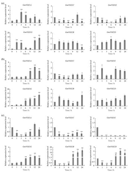 As an evolutionary relic, the exon–intron organization might provide useful information for the evolution of a gene family. As shown in Figure 2a, all GmVOZ genes, interrupted by three introns, displayed similar exon–intron boundaries. To determine cis–acting elements in the promoter region of GmVOZ genes, an analysis of cis–acting elements was performed in the database PlantCARE. The results showed that GmVOZ genes carried abundant stress-related cis–acting elements in their promoters, such as ABRE, G–Box, LTR, MYB, MYC, MBS, TCA–element, CGTCA–motif, W-box or TC-rich repeats, and the numbers varied from one to five. Additionally, two or more light-related cis–regulatory Box4 elements were searched in the promoters of GmVOZ1A, GmVOZ1C, GmVOZ1E, and GmVOZ1G (Figure 2b). The analysis of cis–elements in the promoter of GmVOZ genes contributed to predicting their biological functions.