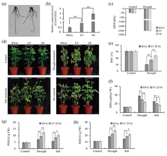 Assessment of the effect of drought and salt stress on GmVOZ1G transgenic soybean hairy roots. (a). GUS detection of the transformation efficiency in soybean hairy roots. (b). qTR–PCR analysis of GmVOZ1G transcription levels in overexpression of GmVOZ1G, RNAi, and empty vector (EV) control soybean hairy roots. The expression level of tubulin was used as a quantitative control. The means of four biological replicates and the standard deviation are presented. (c). Soil water potential (SWP) was determined under normal and drought stress conditions. (d). Phenotypes of soybean composite seedlings with overexpression, RNAi, and EV control hairy roots under drought and salt stress treatments. (e−h). Relative water content (RWC), malondialdehyde (MDA) content, peroxidase (POD), and superoxide dismutase (SOD) activities in leaves of soybean composite seedlings with different transgenic hairy roots under normal and stress conditions. All values are the means and SD of three independent replicates. The asterisks indicate statistical differences in comparison with the corresponding controls at p < 0.01 (**) and 0.01 < p< 0.05 (*), respectively.