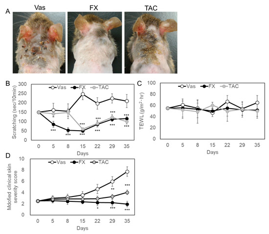 Feature of typical experimental findings in fucoxanthin (FX) or tacrolimus (TAC) treated Nc/Nga mice. Vaseline (Vas), Vas containing FX or TAC were applied to shaved back skin daily for five weeks. Shaving was performed every two weeks. (A) Mice skin symptoms after five weeks of application. Each topical application was treated to groups of six mice and the representative symptoms were shown after five weeks. (B) The scratching behavior was inhibited by FX- or TAC-treated groups compared with Vas-treated group. The scratching behavior was videotaped in the morning after the indicated number of days from the start of the test and scratching time was measured with the hind legs every 10 min. (C) TWEL values were not influenced by FX or TAC. (D) Clinical skin condition in FX or TAC treated skin. Atopic dermatitis (AD) lesions were scored with slight modification of the human criteria. Values are means ± SEM. One-way ANOVA followed by a Bonferroni post hoc test. * p < 0.05, ** p < 0.01, *** p < 0.005 compared with Vas control.