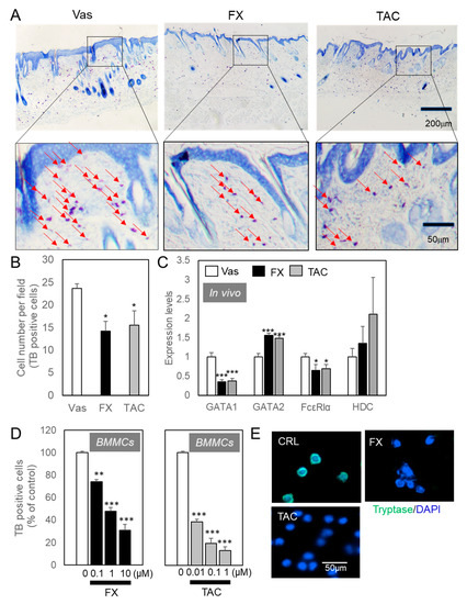 When each material was externally applied to NC/Nga mice skin exhibiting a mild phenotype, 0.1% FX significantly improved AD pathology with better reproducibility than 0.1% TAC (Figure 1A). Vaseline (Vas) treated skin showed a clot from the occipital region to around the scapula due to a scratch, and TAC resulted in improved skin symptoms over the Vas treated group. From the observation of mice, the scratching behavior was clearly suppressed by the treatment of FX or TAC (Figure 1B). Until day 15, the scratching behavior was reduced by FX or TAC, but increased again on day 35. Although the improvement effect was also recognized by TAC ointment, the improvement effect of FX was significant. From the follow-up analysis of trans-epidermal water loss (TEWL) values over time, transcutaneous water evaporation above 40 g/m2·hour was recorded in all mice (Figure 1C). In TAC treated skin, erythema/hemorrhage and excoriation/erosion were observed, but in the FX treated group, no bleeding or blood clotting was observed (Figure 1A,D). FX significantly reduced the modified clinical skin severity score from day 22 after the start of application. During experiments, elevated serum IgE values in Vas-, FX-, or TAC-treated mice were not changed, respectively (Figure S1A). There was no effect on lymphocytes proliferation (Figure S1B). Next, the appearance of mast cells in the affected area was examined by tissue histological analysis (Figure 2A). As for FX or TAC, the number of toluidine blue (TB)-positive mast cells was significantly reduced as compared with the Vas treated group (Figure 2B). Pathological analysis revealed no epidermal thickening after five weeks of continuous application of each compound. qRT-PCR analysis showed that GATA1 and GATA2 were regulated by FX or TAC in vivo (Figure 2C). FX or TAC significantly inhibited FcεRlα, but mature granule marker histidine decarboxylase (HDC) tended to be upregulated by TAC. The detailed analysis was conducted in a mast cell differentiation model using bone marrow-derived mast cells (BMMCs) (Figure 2D,E). Condition medium of WEHI-3 (WHVI-3-CM) for three weeks induced TB-positive cells, but they were suppressed by FX or TAC in a concentration-dependent manner (Figure 2D). The appearance of mast cell tryptase positive was suppressed by FX or TAC (Figure 2E). After differentiation for three weeks, FX showed concentration-dependent inhibitory effects on degranulation of BMMCs (Figure S1C).