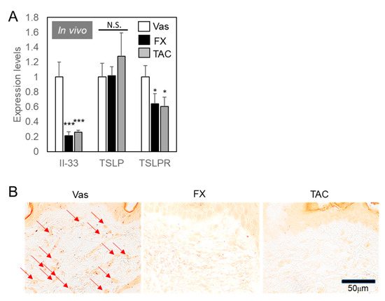 Il-33-dependent eosinophil recruitments blocked by FX or TAC. (A) Keratinocyte-derived cytokines regulated by FX or TAC. Samples used in Figure 2C were analyzed using specific primer pairs. Values indicated means ± SEM from individual mouse averages (n = 6) * p < 0.05, *** p < 0.005 compared with Vas control. N.S. = not significant. (B) Eosinophil recruitments were blocked by FX or TAC. Specimens were reacted with 0.5% congo red solution and washed. Arrows indicate congo red-positive eosinophils.