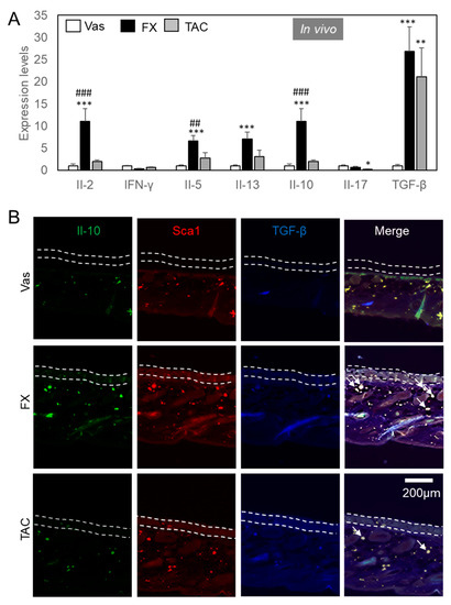FX stimulated Il-10+TGF-β+Sca1+ ILCreg. (A) Cytokine expression levels regulated by FX or TAC. Samples used in Figure 3 were analyzed using specific primer pairs. Values are means ± SEM. * p < 0.05, ** p < 0.01, *** p < 0.005 vs Vas, ## p < 0.01, ### p < 0.005 vs TAC. (B) Il-10+TGF-β+Sca1+ ILCreg dominantly expressed in FX-treated Nc/Nga mice. Sections were reacted with Alexa Fluor 488® anti-mouse Il-10, Brilliant Violet 421 ™ anti-mouse TGF-β1, and PE anti-mouse Sca1 antibodies. All antibodies were used at a 1:500 dilution. The area between the dot lines indicates the epidermal layer. Arrows indicate typical triple-positive cells.