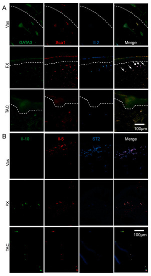 The localization of ILC2 and ILCreg modulated by FX or TAC. FX stimulated Il-2+GATA3+Sca1+ ILCreg. Il-2+GATA3+Sca1+ ILCreg dominantly expressed in FX-treated Nc/Nga mice (A) and Il-5+ST2+ ILC2 in the Vas treated group (B). Sections were reacted with respective fluorescence-labelled antibodies. The area between the dotted lines indicates the epidermal layer. Arrows indicates typical GATA3lowIl-2high cells (A). Panel (B) is focused on the dermis.