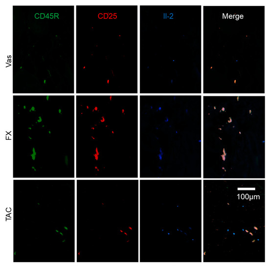 The characterization of Il-2 producers regulated by FX and TAC. FX stimulated Il-2 production in CD45R+CD25+ ILCregs. Some Il-2+CD45R+CD25+ ILCregs were observed in TAC treated skin and others were CD45R-CD25- cells. The panel is focused on the dermis.