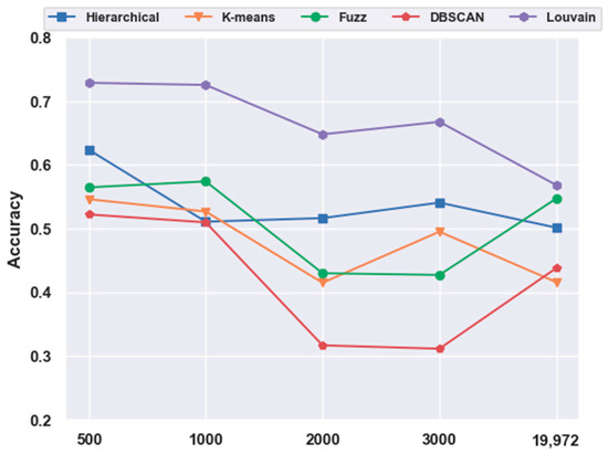 In contrast to Figure 1, in Figure 7, fuzzy C-means instead of the Louvain model performed the best on the 500 gene subset, achieving an accuracy of 0.95. As shown in Figure 11, unlike in Figure 5, without the feature-extraction model, fuzzy C-means achieved the best results on the feature-selected data, whereas Louvain performed the best on the original data. On the original data, Louvain achieved an accuracy of 0.69, which was 12.80%, 42.58%, 18.02%, and 40.87% higher than those achieved with hierarchical clustering, K-means, fuzzy C-means, and DBSCAN, respectively. On 500 gene feature selected data, fuzzy C-means achieved an accuracy of 0.95, which was 62.98%, 117.73%, 56.02%, and 2.49% higher than those of the other four clustering models, respectively. However, as shown in Figure 5, Louvain was the best clustering model without feature extraction on the mouse cortex data.