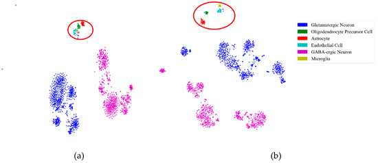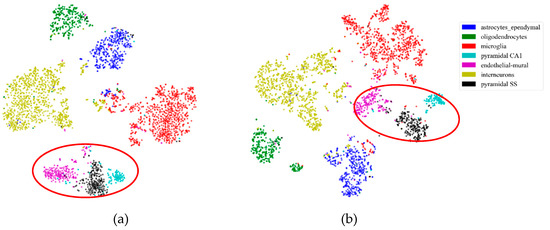 Similarly to the mouse cortex data, Figure 8 illustrates the effectiveness of feature extraction, as shown in Figure 2. We projected the mouse visual cortex data of 500 genes into a 50 dimensional feature space using the PCA feature-extraction model. From Figure 8a, we inferred that the astrocytes, oligodendrocyte precursor cells, endothelial cells, and microglia (in the red oval) were mixed together in the 500 gene space. With PCA feature extraction, these three types of cells could be categorized into four groups, as shown in the red oval in Figure 8b.