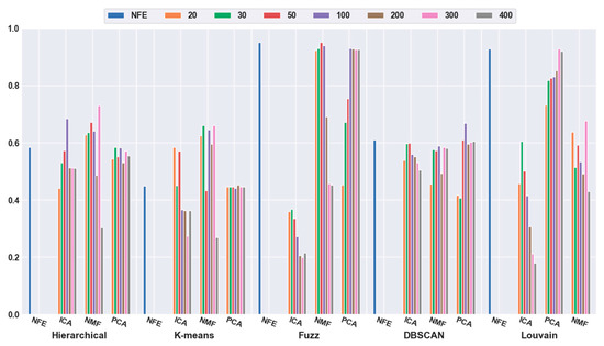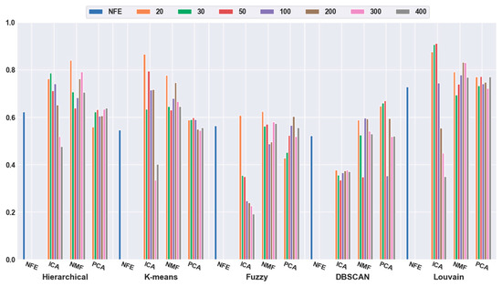 To quantitatively validate the effectiveness of feature extraction, each clustering algorithm was combined with three dimensionality reduction algorithms. The number of dimensions was reduced to 20, 30, 50, 100, 200, 300, and 400. Figure 3 shows that the accuracies of all five clustering algorithms were significantly improved with the feature-extraction methods. For example, when the dimensions were reduced to 20 (orange bar), the combination of hierarchical clustering and NMF obtained a 34.69% higher accuracy than hierarchical clustering with NFE; the K-means-and-ICA-based combination model achieved a 58.18% higher accuracy than the K-means with NFE; the fuzzy C-means-and-NMF-based combination obtained a 10.60% higher accuracy than the NFE-based model; when the dimensions were reduced to 50 (red bar), the accuracy of the DBSCAN-and-PCA-based combination was 28.30% higher than that of DBSCAN with NFE; and the accuracy of the Louvain and ICA-based combination was 25.11% higher than that of Louvain with NFE. Based on all of the results described above, we concluded that a higher accuracy can be obtained using feature extraction.