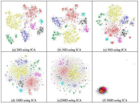 Next, we assessed whether feature-extraction methods always benefit scRNA-seq data. To validate the benefit of feature extraction, we compared the clustering results for different scales of feature space and different extraction strategies. As shown in Figure 4, ICA extracted the features from 500 genes to 20 features (Figure 4a), 30 features (Figure 4b), 50 features (Figure 4c), 100 features (Figure 4d), 200 features (Figure 4e), 300 features (Figure 4f), and 400 features (Figure 4g), respectively. From Figure 4a–c, it is clear that all seven types of cells could be distinguished; however, in the following four subfigures (Figure 4d–g), different cells were mixed and difficult to separate. This means that in these four generated feature spaces, satisfactory results were difficult to achieve.