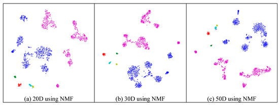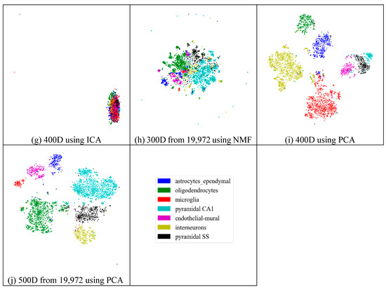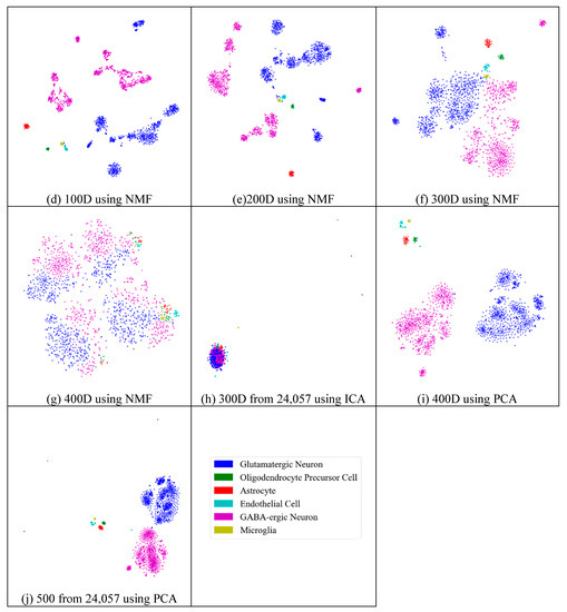 Similarly to the results from the mouse cortex data, feature extraction did not always improve the clustering performance. As shown in Figure 10, we compared the results of different feature spaces and different feature-extraction models on the mouse visual cortex data. NMF extracted the feature space from 500 genes to 20 features (Figure 10a), 30 features (Figure 10b), 50 features (Figure 10c), 100 features (Figure 10d), 200 features (Figure 10e), 300 features (Figure 10f), and 400 features (Figure 10g). From Figure 10a–e, all six types of cell could be distinguished. However, in the following two subfigures (Figure 10f,g), these cells were mixed and difficult to classify. Therefore, in the two feature spaces, the clustering algorithms could not achieve satisfactory results. For the ICA model, Figure 10h (300 features extracted from 24,057 genes by ICA) showed a disordered group; however, PCA did not show apparent disorder in either the feature-selected data (Figure 10i) or the original data (Figure 10j). Similarly to the results from the former data, PCA performed better than the other feature-extraction methods.