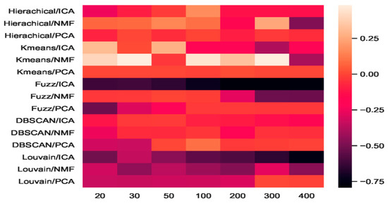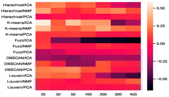 Compared with the high fluctuation of the ICA-based combinations, we discovered that the other eight combinations of hierarchical + PCA, K-means + PCA, DBSCAN + PCA, Louvain + PCA, hierarchical+ NMF, K-means + NMF, fuzzy C-means + NMF, and Louvain + NMF all achieved red promotion (Figure 6). Fuzzy C-means + PCA underwent a dark decline at the beginning (e.g., 20 dimensions and 30 dimensions), whereas DBSCAN + NMF was dark in the middle (50 and 100 dimensions). Considering the robustness of the combinations, PCA + NMF did not fluctuate significantly with dimension changes, and the performance was relatively stable.