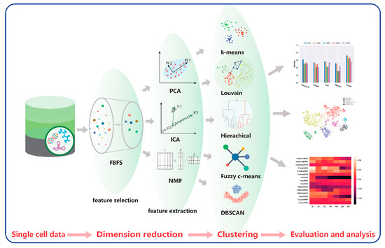Our proposed framework contains four modules. The first module is data acquisition and preprocessing. The second module is the dimensionality reduction module, including FBFS, PCA, NMF, and ICA for highly dimensional scRNA-seq data. Subsequently, for the clustering module, we adopted hierarchical clustering, K-means, fuzzy C-means, DBSCAN, and Louvain. The last module is the visualization and evaluation. We performed a quantitative analysis of the data results and a visual analysis using t-SNE. The analysis included the performance of each clustering algorithm on the scRNA-seq data and the effect of dimensionality reduction on clustering. The details of the 20 combinations are listed in Table 2.