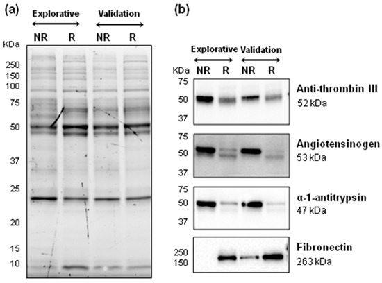 Immunoblotting validation of differential abundance of plasma proteins between non-relapsing (NR) and relapsing (R) HL (pools of three samples each). (a) Chemidoc image of gel before transfer of proteins to nitrocellulose membranes. (b) Blots probed with primary antibodies against four differentially abundant proteins.