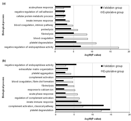 Most significant (p < 0.01) biological processes associated with differentially abundant plasma proteins according to DAVID Bioinformatics Resources and common to the explorative and validation analyses. (a) Non-relapsing HL. (b) Relapsing HL.