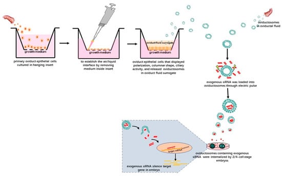 Schematic illustration showing the potential technology involved in delivering exogenous siRNAs into preimplantation embryos via OVS isolated from oviductal fluid. Alternatively, OVS could also be isolated from surrogate oviduct fluid secreted by oviductal epithelial cells cultured in an air–liquid-interphase (ALI) system and displaying normal morphological differentiation (e.g., polarization, columnar shape and ciliary activity). After isolating the OVS, exogenous siRNAs can be loaded into them by electroporation. After adding these OVS into the embryo in vitro culture (IVC) system, they can be internalized, eventually silencing target genes in the embryos.